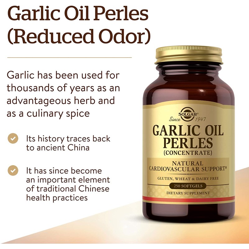 Solgar Garlic Oil Perles, 250 Softgels - Natural Cardiovascular Support - High-Quality Garlic Oil Concentrate, Reduced Odor - Gluten Free, Dairy Free - 250 Servings