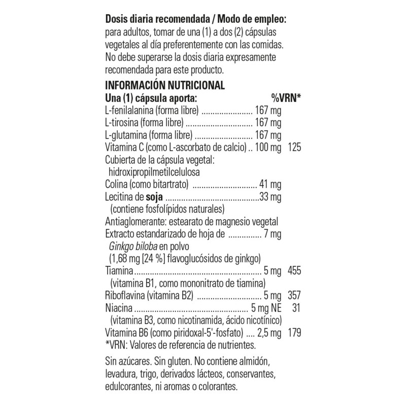 - EASILY ABSORBABLE; 1-2 vegetable capsules, for easy absorption, of Neuro-Nutrients will provide L-Phenylalanine, L-Tyrosine, L-Glutamine, Vitamin C, Choline, Soya Lecithin, Vitamin B1, B2, B3 & Ginkgo Biloba Leaf Extract