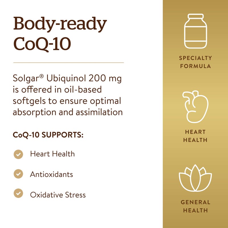 - Oil-Based For Optimal Absorption; Solgar Ubiquinol 200 mg is offered in oil-based softgels to ensure optimal absorption and assimilation
