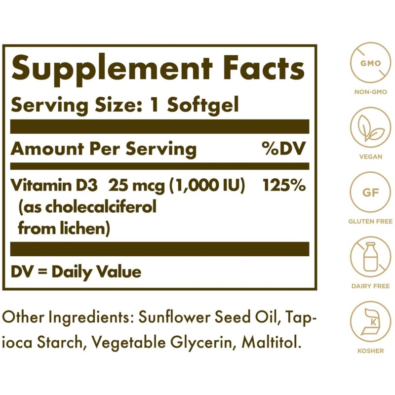 • Immune System Support; Solgar Vitamin D3 (Cholecalciferol) 25 mcg (1000 IU) Softgels support a healthy immune system and neuromuscular function