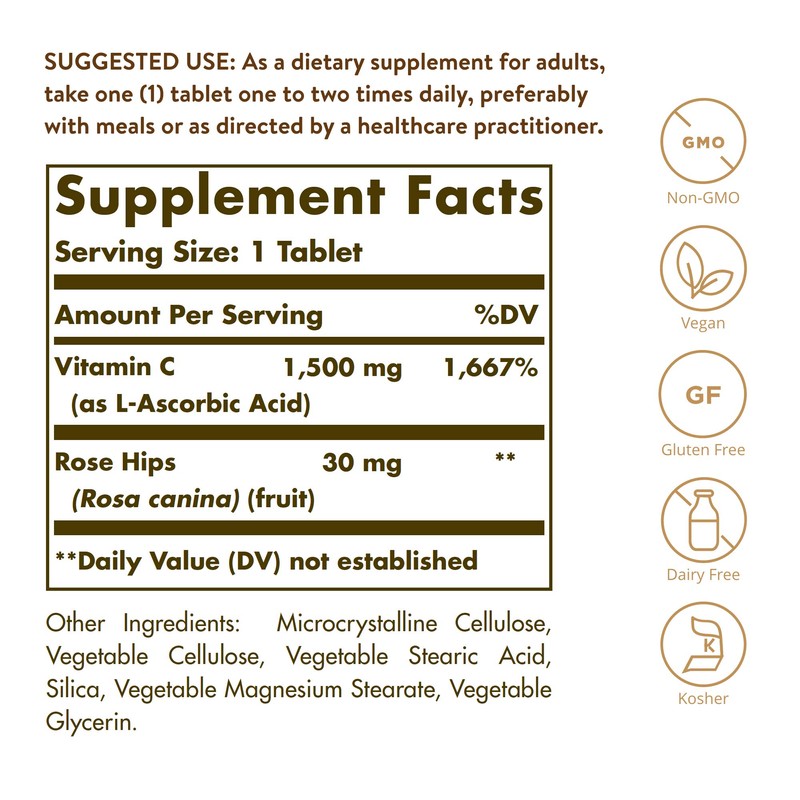- Non GMO And Gluten Free; Solgar Vitamin C 1500 mg with Rose Hips Tablets are suitable for vegans; Free of: gluten, wheat, dairy, soy, yeast, sugar, sodium, artificial flavor and sweetener