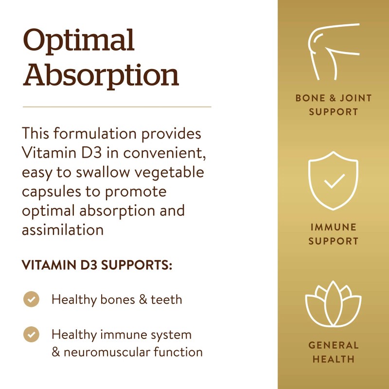 - Maintain Healthy Bones & Teeth; Vitamin D is required to promote calcium absorption, which helps maintain healthy bones and teeth; Solgar Vitamin D3 Vegetable Capsules provide 125 mcg (5000 IU) in one easy to take veggie capsule