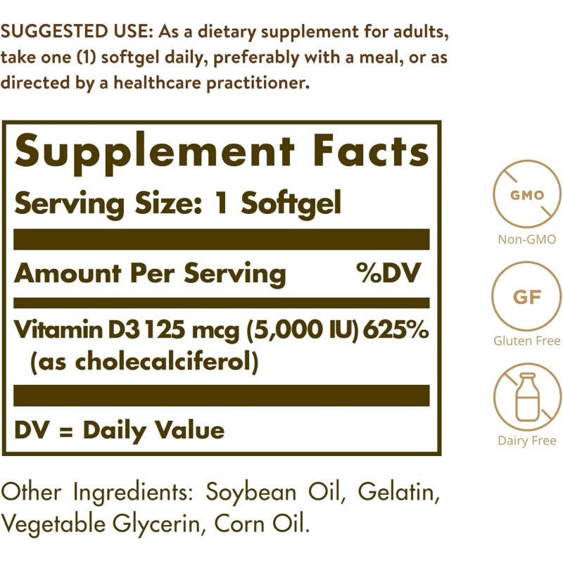- Non-GMO, Gluten Free, Dairy Free; Solgar Vitamin D3 5000 IU Softgels are free of: gluten, wheat, dairy, soy, yeast, sugar, sodium, artificial flavor, sweetener, preservatives and color