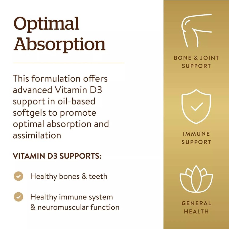 - Optimal Absorption; The Vitamin D3 in this product is the same form produced by the body when our skin is exposed to sunlight; As we age, our bodies may absorb less D3; These advanced, oil-based softgels promote optimal absorption and assimilation