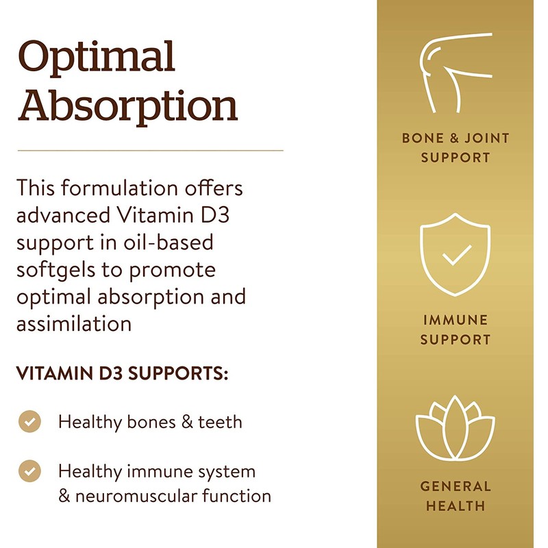 • Optimal Absorption; The Vitamin D3 in this product is the same form produced by the body when our skin is exposed to sunlight; As we age, our bodies may absorb less D3; These advanced, oil-based softgels promote optimal absorption and assimilation