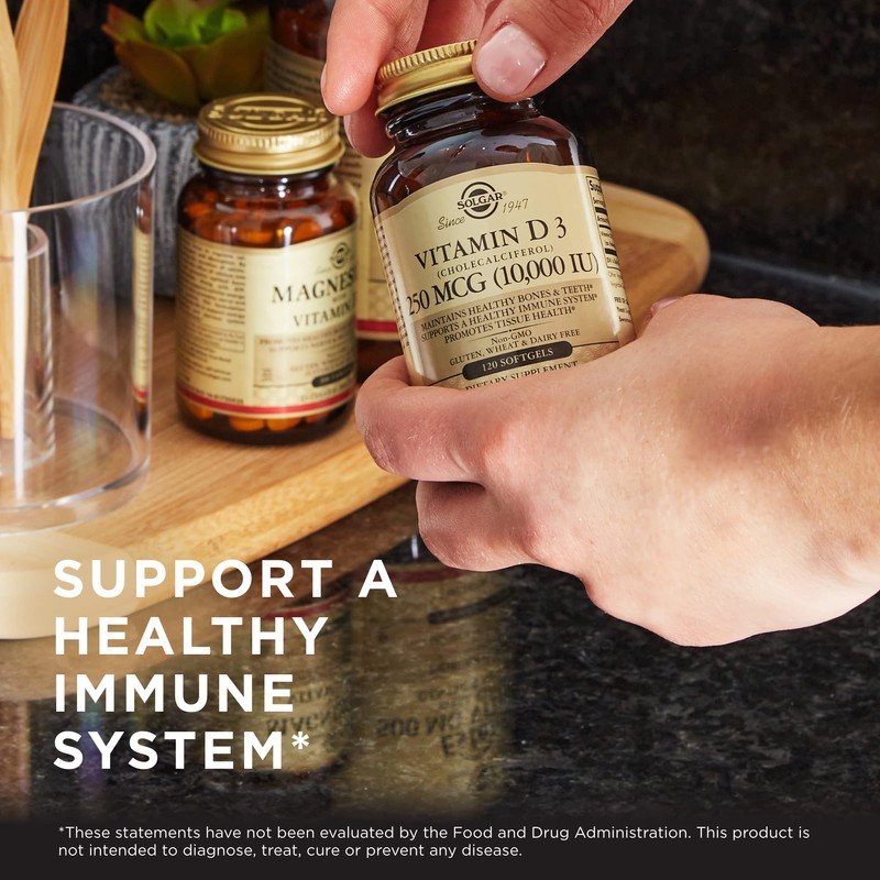 - Support Your Immune System; Solgar Vitamin D3 (Cholecalciferol) 250mcg (10000 IU) Softgels support a healthy immune system and neuromuscular function