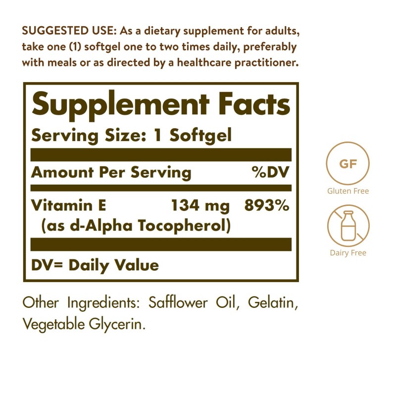 - Gluten, Wheat & Dairy Free; Solgar Vitamin E 200 IU Alpha is free of: gluten, wheat, dairy, yeast, sugar, sodium, artificial flavor, sweetener, and color; Suitable for vegetarians