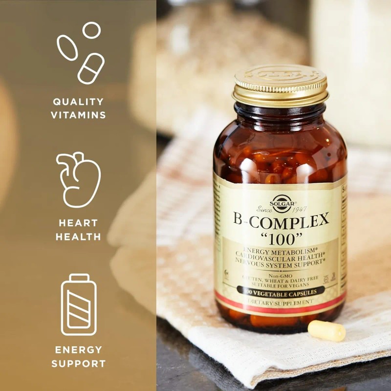 Solgar Vitamina B Complex "100" es un suplemento nutricional diseñado para apoyar el bienestar general y el funcionamiento óptimo del organismo. Este producto, presentado en cómodas tabletas, combina una potente mezcla de vitaminas del grupo B, incluyendo Tiamina, Riboflavina, Niacina, Vitamina B6, Vitamina B12 y Biotina, esenciales para el metabolismo energético y la salud del sistema nervioso.