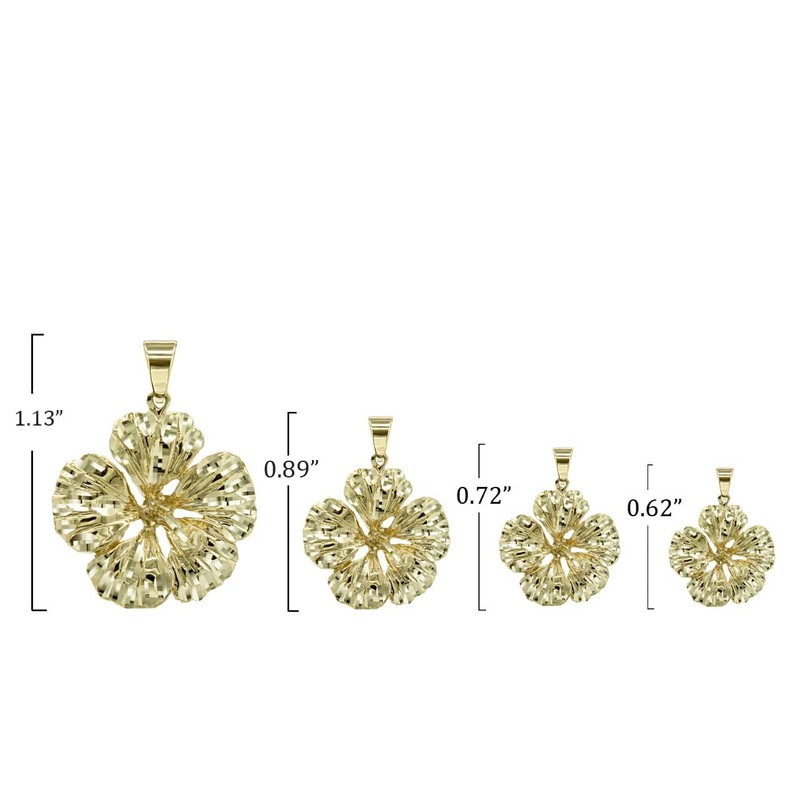 This pretty 10k Yellow Gold pendant charm features a Hawaiian Hibiscus Flower in 4 sizes to choose. A hibiscus flower is from the mallow family, malvaceae. These magnificent flowers comprising several hundred species and are found in warm temperate, subtropical and tropical regions throughout the world. The hibiscus flower is usually given or worn by women. In North America, a hibiscus means a perfect wife or woman. Fresh and fun, this flower pendant adds a touch of fantasy to any look. Wear this Flower pendant year-round to make you think of bright spring days. This pendant is an ideal gift to attract positive vibes from the universe. Individually hand polished to a lasting high sheen polish finish. This pendant is both of unsurpassed quality and impressive design with it's sleek modern look, it's sure to fit for any occasion.
