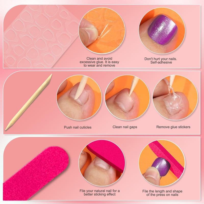 • 🏖【Easy To Use】First clean your toenails, then choose the right toenails size, stick double-side adhesive tabs on toenails and press for a while, you can get your favorite fashion style toenails in just a few simple steps. Due to the limited use of jelly glue, we recommend that you use your own glue.