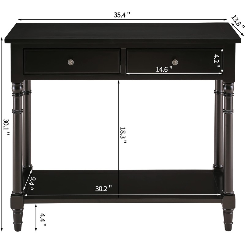 Solid Wood Console Entry Table with 2 Drawers, Accent Sofa Table with Storage Shelf, Narrow Entryway Hall Table for Living Room Office Easy Assembly 35.54" L x 30" H x 13.78" W Black SFZ-004BK