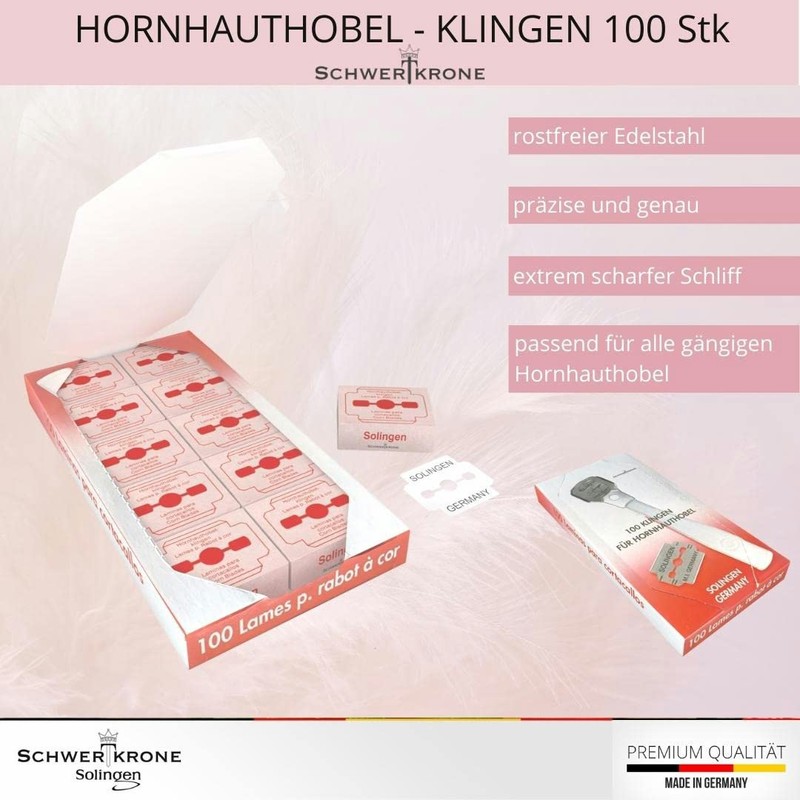 ? PROFESSIONAL PEDICURE 100 Solinger replacement blades for calluses, perfect for removing corns and calluses. ;? MAXIMUM HYGIENE: Blades individually packed in handy sets of 10 for maximum hygiene during pedicure.;? SUITABLE FOR ALL TYPES OF CORNAL Slicers: These blades are ideal for all types of slicers, such as treating calluses and corns. ;? LONG LASTING STOCK The pack contains a supply of high quality blades for professional or private callus removal and foot care;? Sword crown quality from Solingen