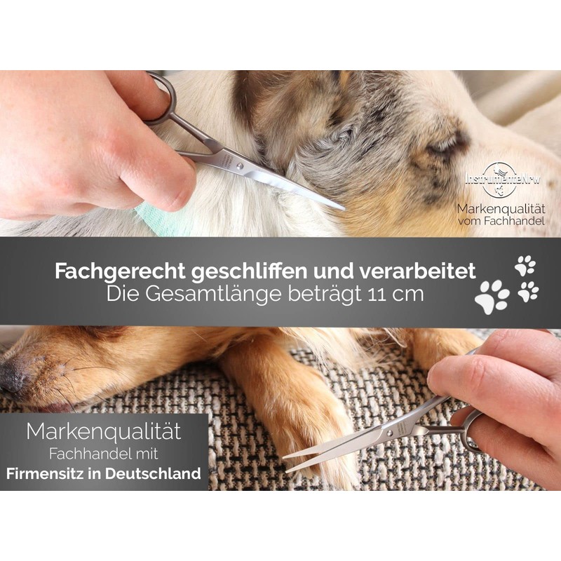 - Dog hair scissors from Solingen ✯ Professional grooming scissors, dog scissors, paw scissors from Solingen for a well-groomed coat. Made in Germany. The pet hair scissors have a total length of 11 cm and the sharp straight cutting surface has a length of 4.3 cm. The scissors tips are slightly blunted (not nail tip). Made of rust-proof high-quality stainless steel. The scissors have an adjustment screw for adjusting the scissors blades.