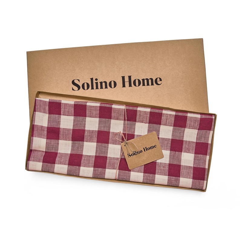 Solino Home Checkered Linen Table Runner 90 inches Long - 100% Pure Linen Beet and Cream Plaid Table Runner 14 x 90 Inch Ideal for Wedding, Spring, Easter - Morgan Check