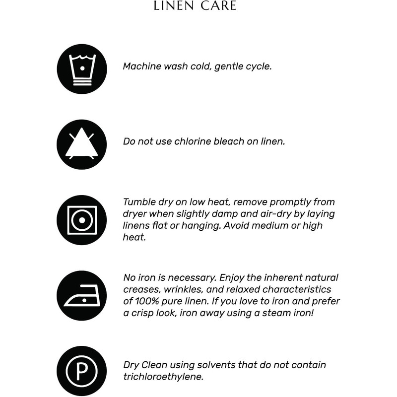 - Easy Care - Machine Washable, Low Iron as Needed, Steam Iron for a crisp look. The beauty of each pure linen piece is the natural fibers and classic aesthetic that mellows with each washing, betters with age and requires minimal care