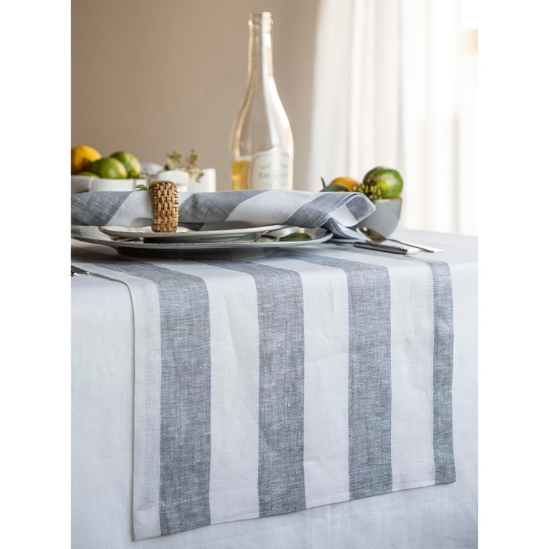 Whether you're serving indoors or poolside, the bold stripes of our Cabana Stripe Tablerunner brings any table a statement look that sets an inviting scene. Made of 100% pure linen, this tablerunner provides classic style that pairs well with your favorite dinnerware and flatware for casual entertaining.