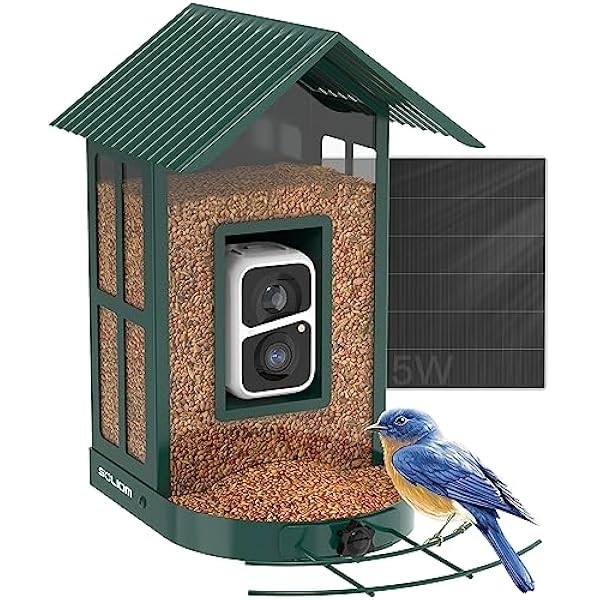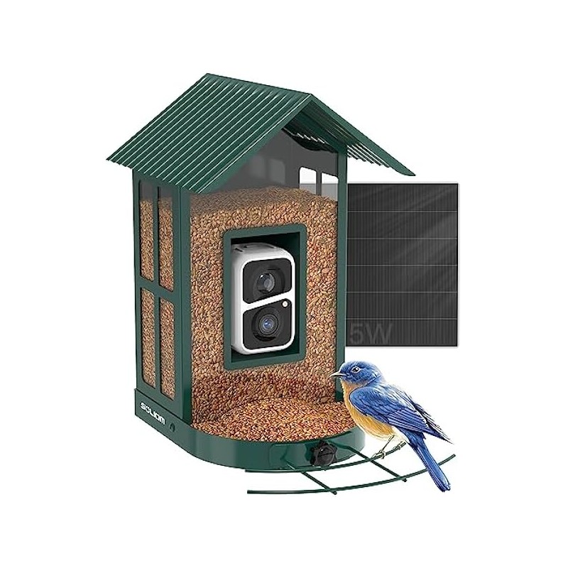 SOLIOM BF08- Metal Solar Bird Feeder Camera with AI Identify Species, Wild Bird Watching Cam, Live View, Instant Notifications with 5W Solar Panel(Green)