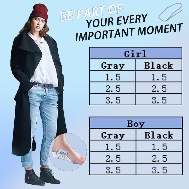 - Widely used: invisible shoe insoles increase height offers three heights of 1.5 cm, 2.5 cm and 3.5 cm and is available in two colours: grey, black. Height Increase insoles suitable for a variety of shoe types. Such as flat shoes, sports shoes, high shoes, etc., allow you to choose according to your preferences and shoe needs and meet your needs for different occasions