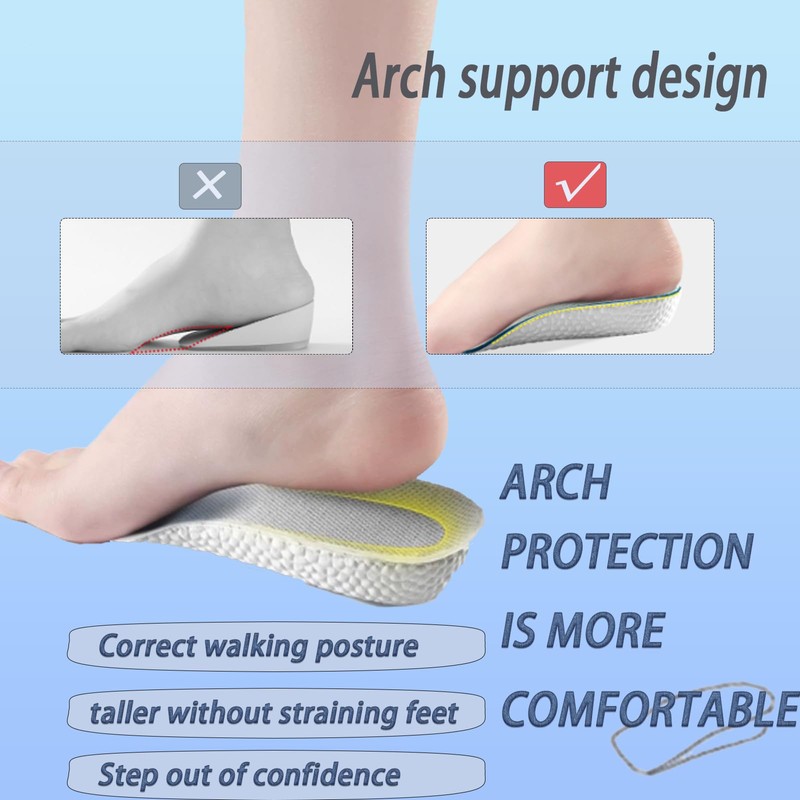 - Arch support: shock absorption shoe raiser uses a curved top that follows the curve of the human foot and increases height without tiring the feet, relieving the arch of the foot, reducing fatigue of the legs and back and providing all-day comfort. Orthopedic high pads allow you to enjoy the convenience of flat shoes while you grow taller.