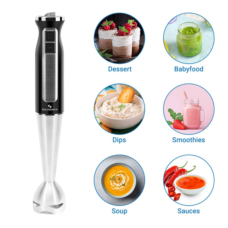 SOLTRONICS 5-in-1 Hand Blender, 5-in-1, 8-Speed 500 Watts Stick Blender with 860ml Food Grinder, 600ml Container, Milk Frother, Egg Whisk for Puree Infant Food, Smoothies, Sauces and Soups, Black