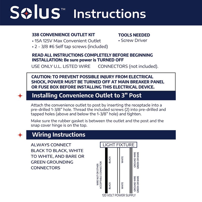 - 120 Volt grounded convenience outlet, UL Listed indicating true operational safety. Energy saver and coated with a weather resistant black finish to match your lamp post.