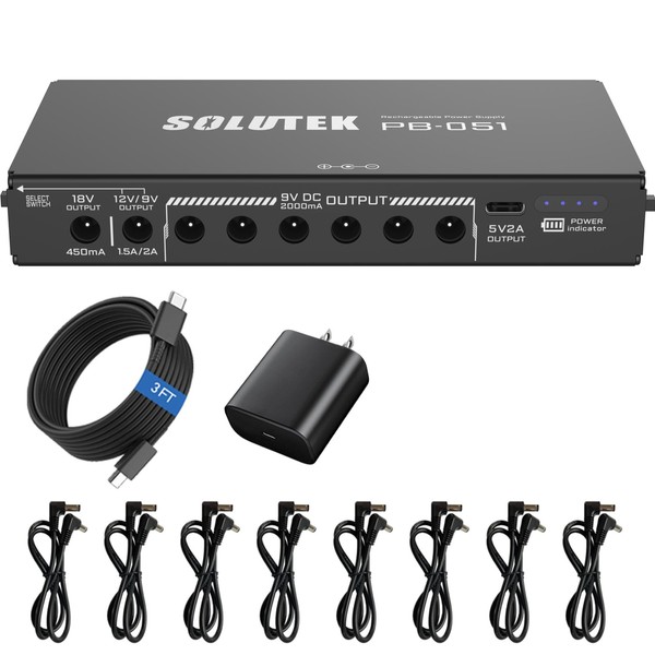 - 【Regulated | Stable】As known a stable and sufficiently output is so important to maintain the best sound quality. So Unlike cheap solutions of others, Solutek PB051 is born as a Regulated Rechargeable Pedal Power Supply,which can always supply 9V,12V,18V under various loads for 100% of the discharge.