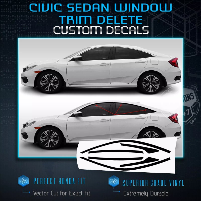 Solutions_247 provides a Premium Line of Vinyl Decal Overlay for your Civic Sedan.  We have the most color options and the best price for our customers.  We provide only the highest grade vinyl that will have long lasting finish for long term outdoor exposure.  Easy installation and perfect fitment for the both sides of the Window Trim application.  Our Vinyl is a dual cast file specifically designed to provide dimensional stability and durability without the need for an over laminate. The pressure-activated adhesive allows you to slide and re-position the film until you apply firm pressure to the exterior of the vehicles.