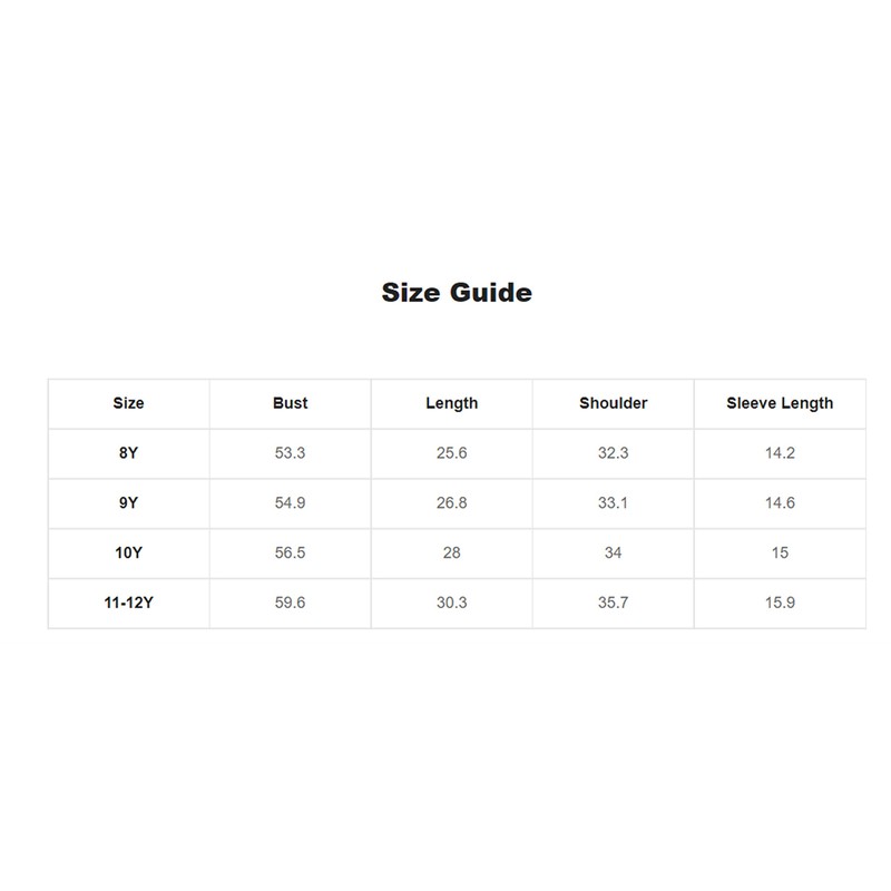 11-12Y: Bust: 59.6", Length: 30.3", Shoulder: 35.7", Sleeve Length: 15.9"
