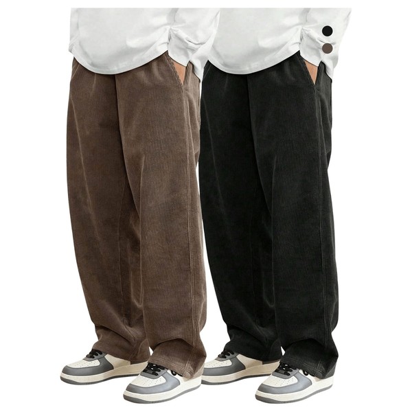 SOLY HUX Men's 2 Piece Corduroy Pants Drawstring Elastic Waist Straight Leg Baggy Pants with Pockets Brown and Black Large