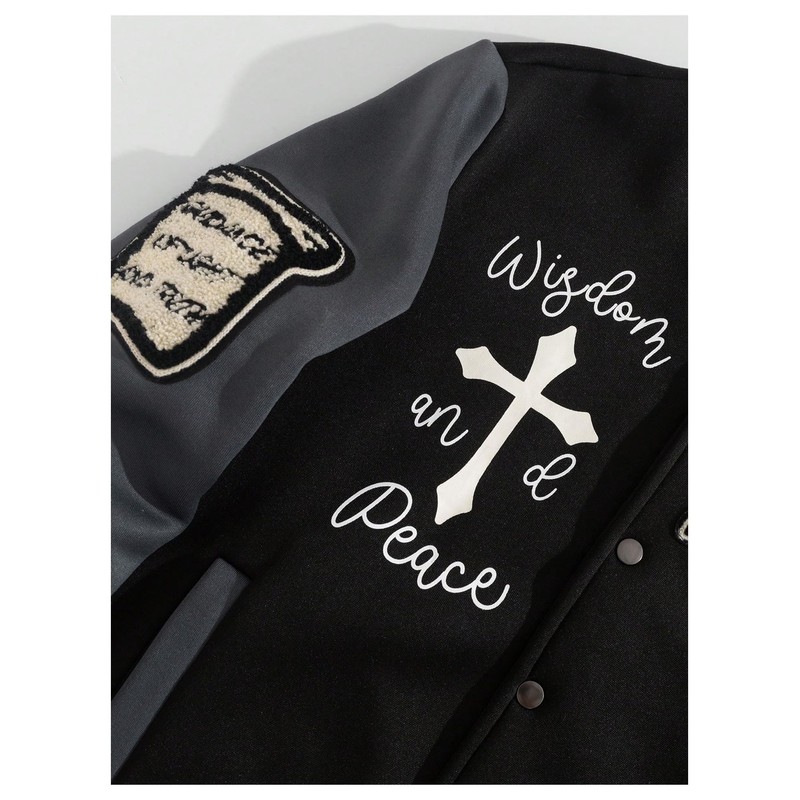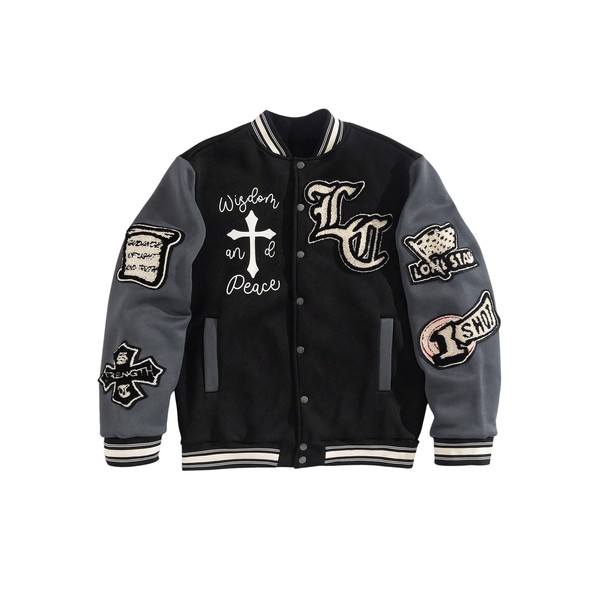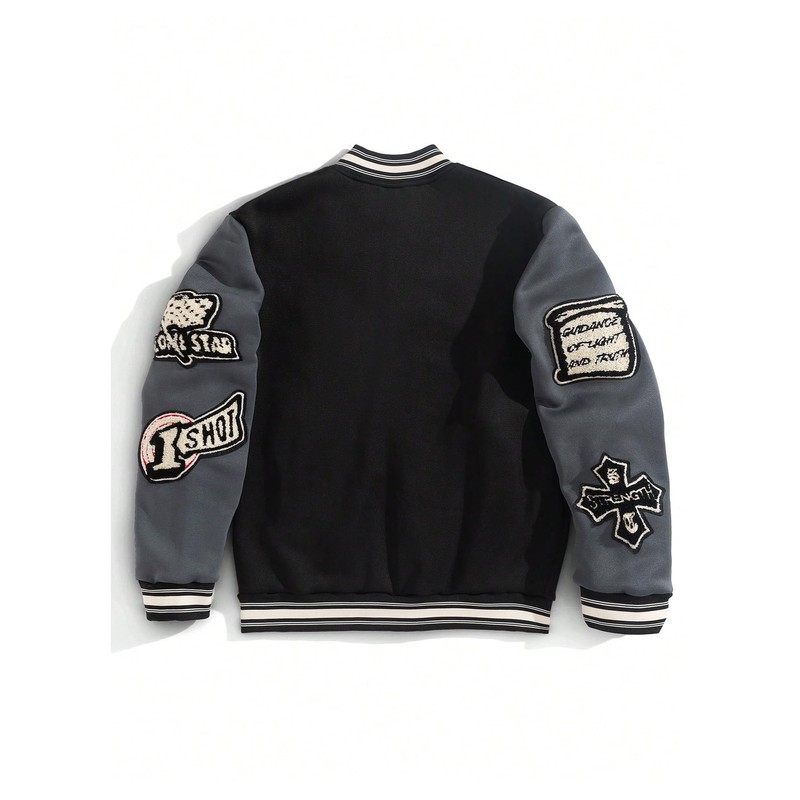 - Feature: Colorblock, letter patched, striped, long sleeve, pocket, button front, baseball collar, mens varsity jacket, fashionable