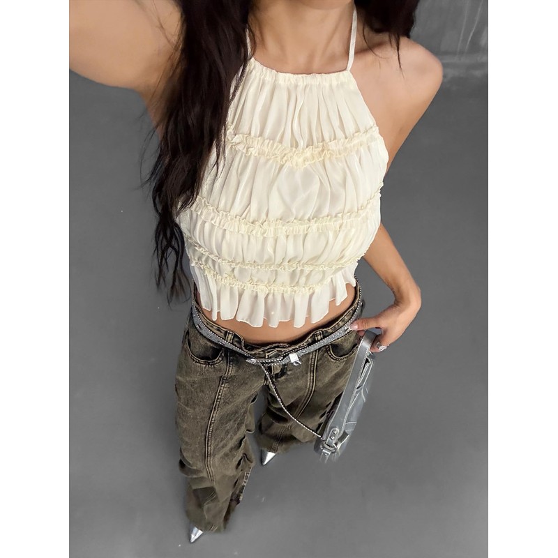 - Features: Halter, tie back, backless, ruched, ruffle hem, sleeveless, womens tops, fashionable
