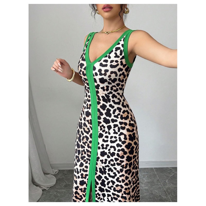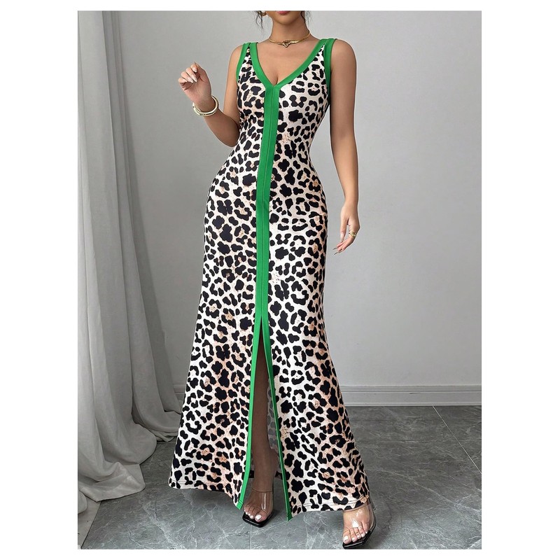 • Feature: Contrast binding, leopard print, v neck, sleeveless, split front, long maxi dress, tank dress, pencil bodycon dress, slim fit, fashionable