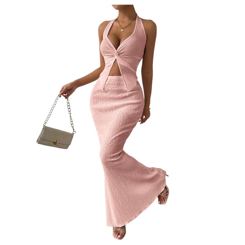 - Feature: Halter, tie back, backless, twist front, sleeveless, cami tops and bodycon long skirt, 2 piece skirt set for women, fashionable