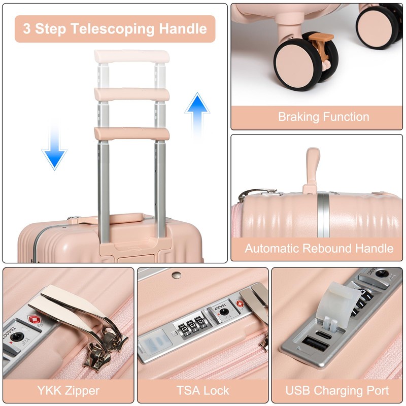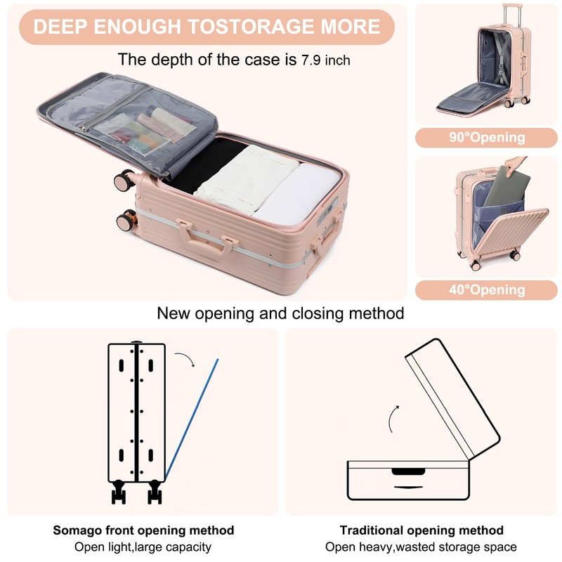 Somago Carry on Luggage Front Open 22x14x9 Airline Approved Lightweight Suitcase with Cup Holder and USB Port Aluminum Frame Polycarbonate Spinner Hard Suitcase with TSA Lock (Pink)