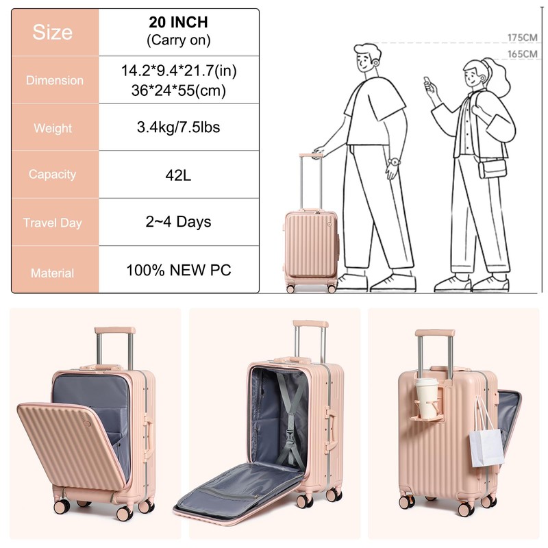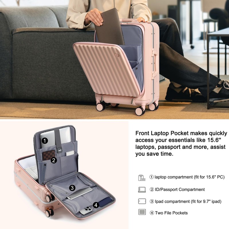 - FRONT OPENING DESIGN: This airline approved carry on luggage with front laptop compartment for quickly accessing electronics, the main compartment features a front opening, saving space and making access to your belongings a breeze.We offer a 5-YEAR guarantee replacement service covering all manufacturing defects.