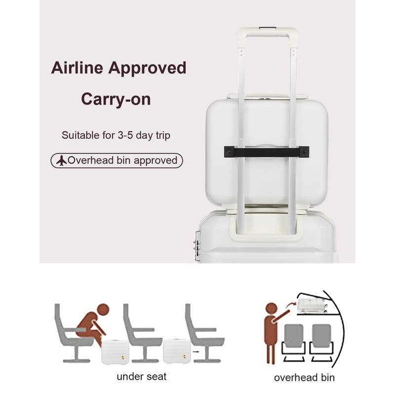 • PACKING INCLUDE: 1pc 20IN carry on luggage (22" x 15.35" x 9", 5.51 lbs) and 1pc 14IN (12" x 13.2" x 6.6", 2.09 lbs) cosmetic travel case and 1pc luggage tag and 6pc set packing cube, The back of the cosmetic travel case is designed with a fixed belt structure that allows it to be linked to the trolley case.