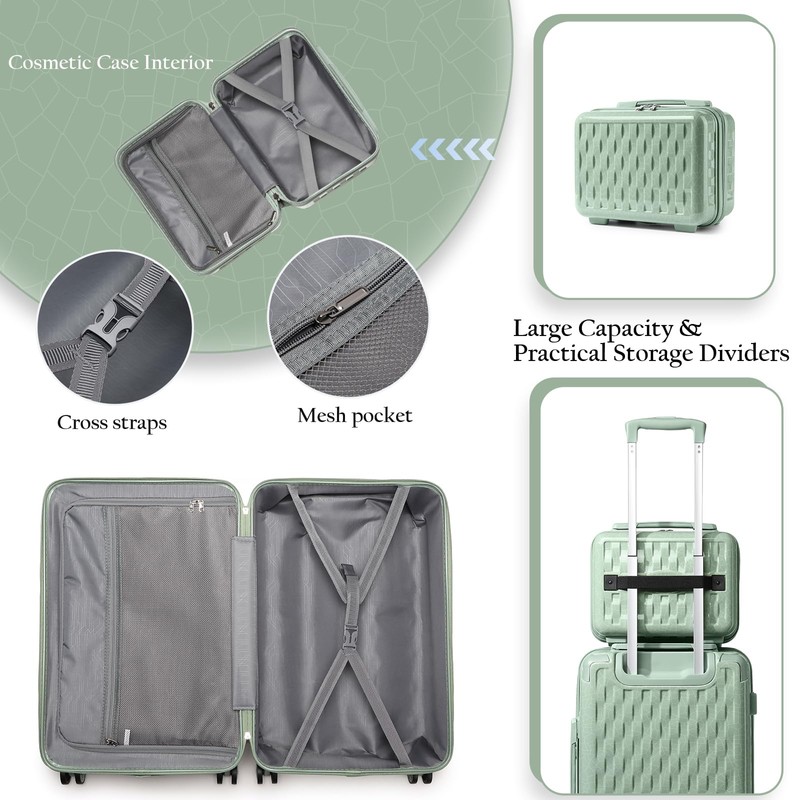 - 【Dimensions and PC ABS Material】:13" Cosmetic Case: 12x7x10, 1.7LBS. 20" carry on luggage: 15x9x22 inch(include wheels), 5.7LBS, 40L. 24" checked luggage: 17.5x11x26 inch, 6.8LBS, 72L. The travel luggage sets are using 100% new PC and ABS materials instead of mixing old and new materials, which can make our baggage have better resilience and toughness, and the case shell is lightweight while not easy to crack.