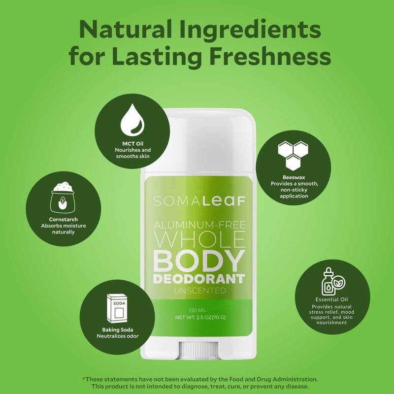 - ✅Essential Oils for Fresh Aroma: Infused with natural essential oils, SomaLeaf deodorant gives you a fresh and pleasant scent throughout the day. These essential oils are not just for fragrance—they also provide healing and therapeutic benefits to your skin. Enjoy a refreshing, rejuvenating aroma that uplifts your senses while keeping you naturally protected.