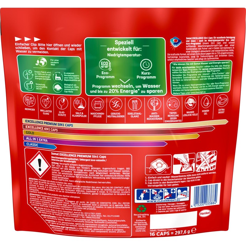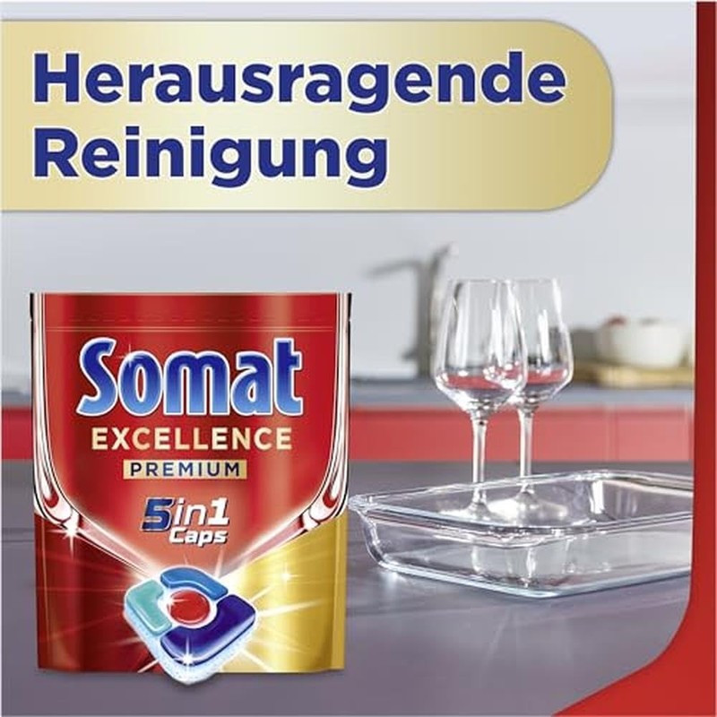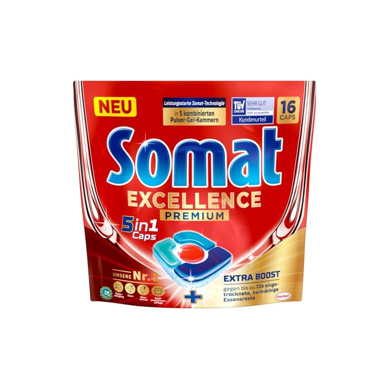 Somat Excellence Premium 5-in-1 Caps (16 Caps), Quick-Dissolving Dishwasher Tablets with Extra Boost, Somat Caps Remove Even 72 Hours of Dried, Stubborn Food Leftovers