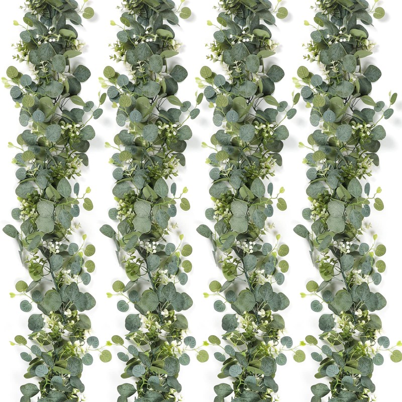 - 【Set includes】: 4 packs 5.9FT/180CM long artificial greenery garlands with sliver dollar eucalyptus leaves, boxwood eucalyptus leaves, and baby breath gypsophila flowers.