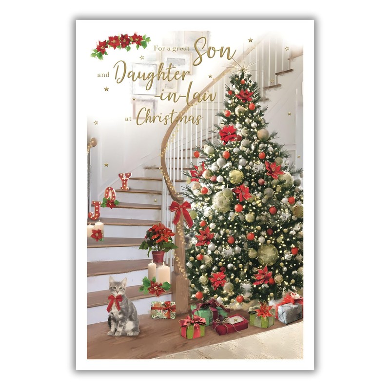 - 🎁 FESTIVE DESIGN: An artistic card featuring an attractive illustrated design of a decorated Christmas tree and cat by a staircase, with the message "For a great Son and Daughter-in-Law at Christmas" on the front. This card is finished with embossed, metallic gold foil details, and is supplied with a coordinating envelope.