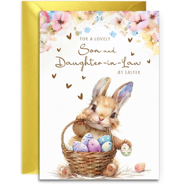 Son & Daughter-In-Law Easter Card - Bunny with Easter Eggs Design - A5 Size with Gold Envelope