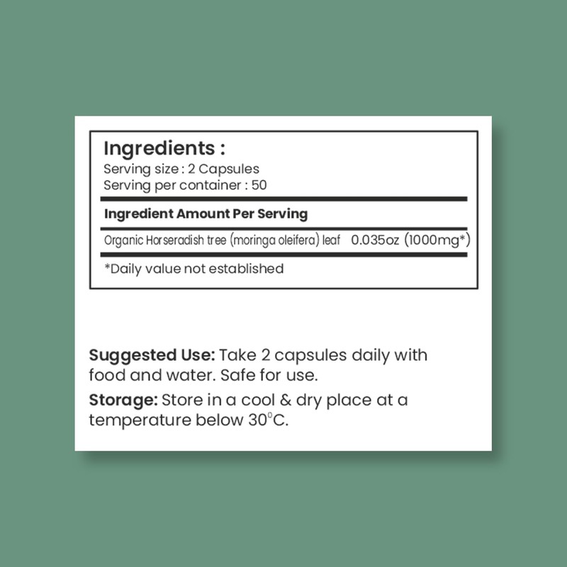 - Moringa Capsules contain 1000mg Moringa extract, which is rich in vitamins, minerals, and antioxidants.