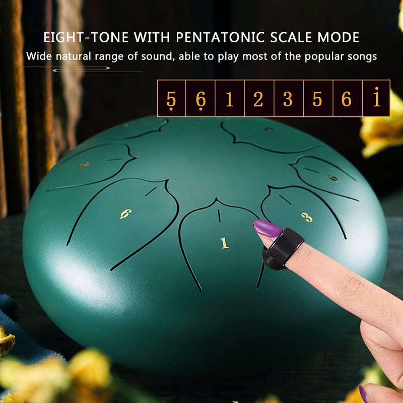 - 8 tones 6 inch: the 6 inch steel tongue drum has a standard 8 note with pentatonic scales, it has a large natural sound range that allows you to play most popular songs. Comes with a drum bag, 2 drumsticks with stand, a music score, 4 finger picks and a scale sticker.