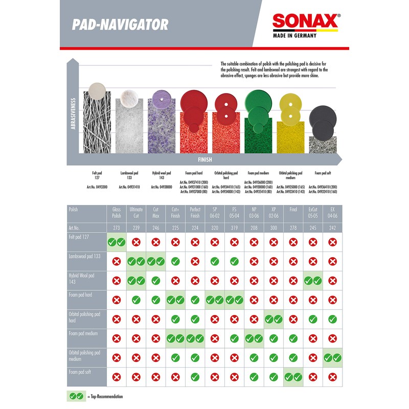 - Removes sanding marks of P2500 grit or finer, Recommend applying with a DA polisher or Sonax Yellow Pad (not included) if you are doing slight correcting, if using as a third step or finishing polish use Sonax Black Pad (not included) which is designed to make buffing and polishing easy