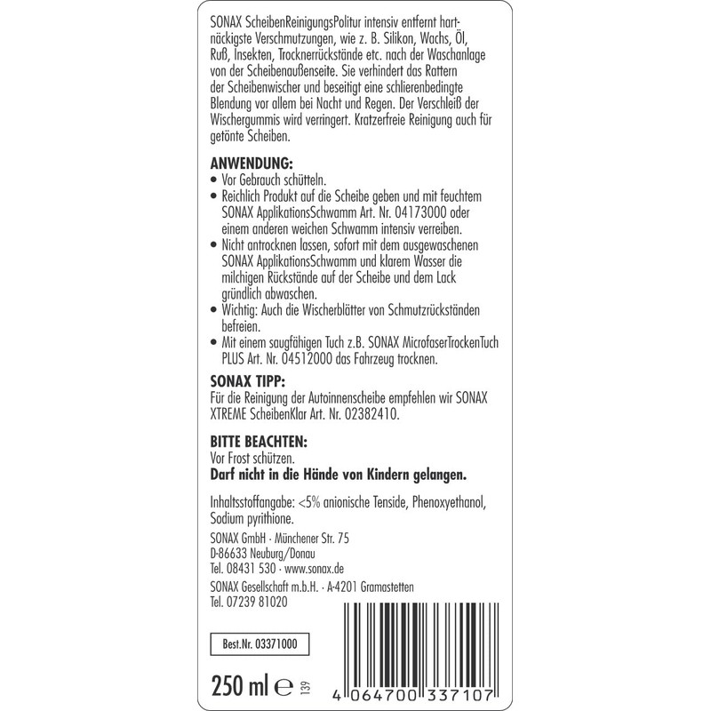 - Lieferumfang: 1x SONAX 03371000 ScheibenReinigungsPolitur (250 ml)