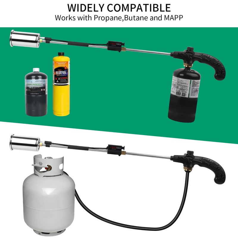 - High Safety and Double Guarantees100% passed high standard leak test before shipping. This propane weed torch also contains internal safety mechanisms that restricts 99% of propane flow, in case of leakage. All steel parts are built with heat-stable steel, enhanced anti-corrosion eliminated risk of leakage in long time.