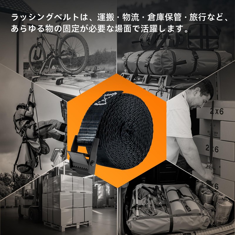 - "Multi-Purpose" The cargo fastening belt is widely used in the industries such as transportation, transportation, logistics, warehouses and so on, suitable for packing and securing a variety of items such as roof carrier belts, bicycles, surfboards, refrigerators, and furniture. In addition, it is used to prevent your luggage and furniture from collapsing during an earthquake