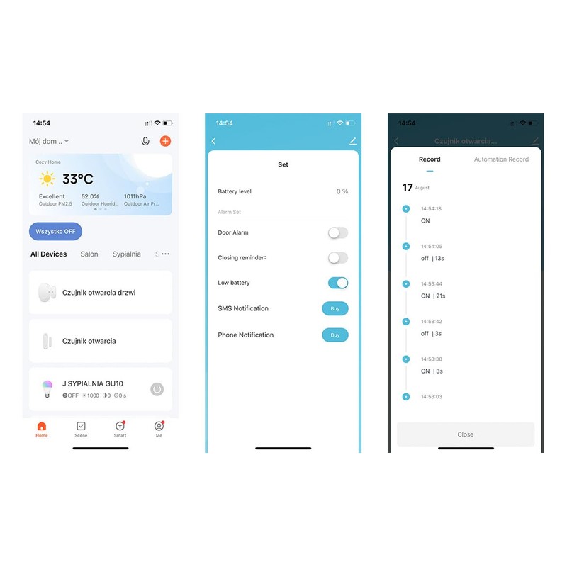 - Einfache Konfiguration von Benachrichtigungen: Alarm, Öffnen, Tür nicht geschlossen, schwache Batterie