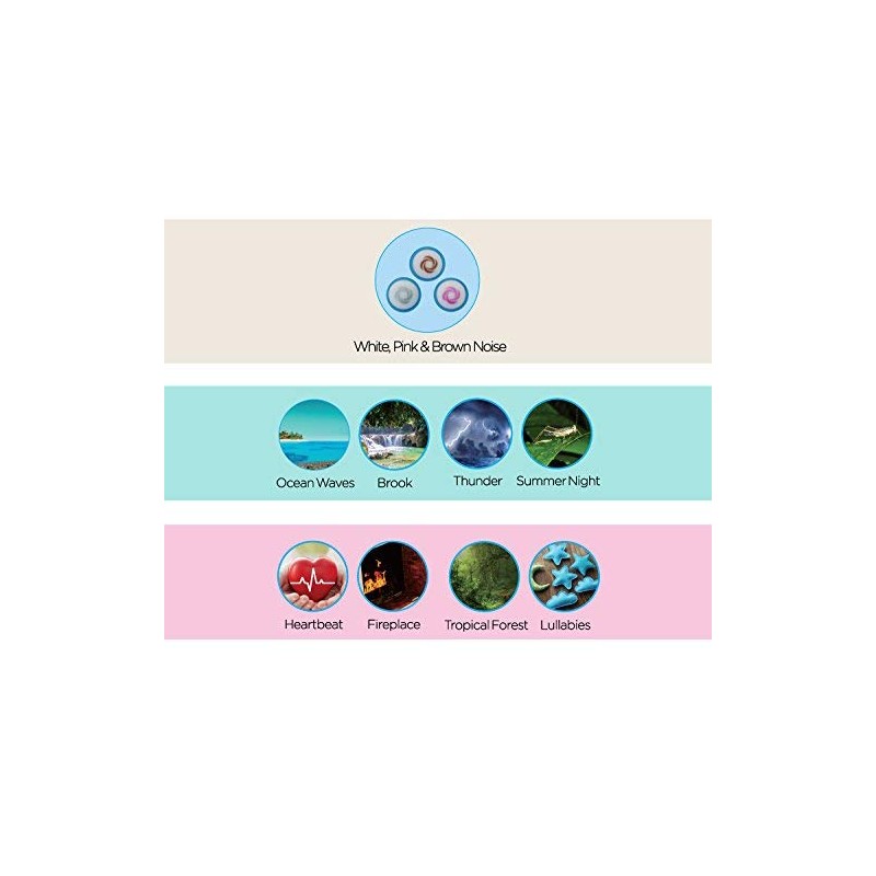 - 10 Soothing White Noise and Natural Sound Tracks and 7 Baby Lullaby Tracks, To create the most realistic and natural environment. Choose from: White Noise / Brown Noise / Pink Noise / Tropical Forest / Ocean / Brook / Fireplace / Thunder / Heartbeat / Summer Night or Baby Lullabies. Can be played continuously non-stop or with auto-off timer option for 15, 30 or 45 minutes.